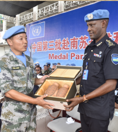 聯(lián)南蘇團(tuán)維和部隊(duì)向國(guó)際友人贈(zèng)彩陶助和諧
